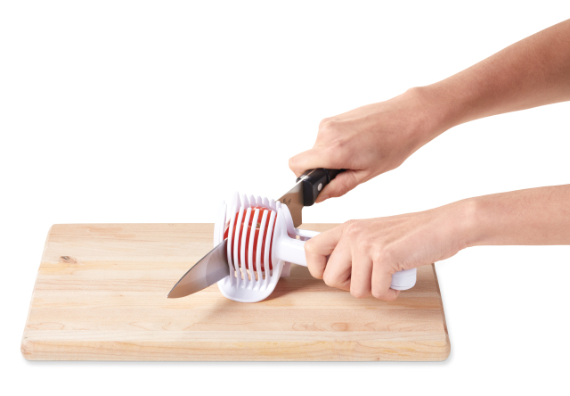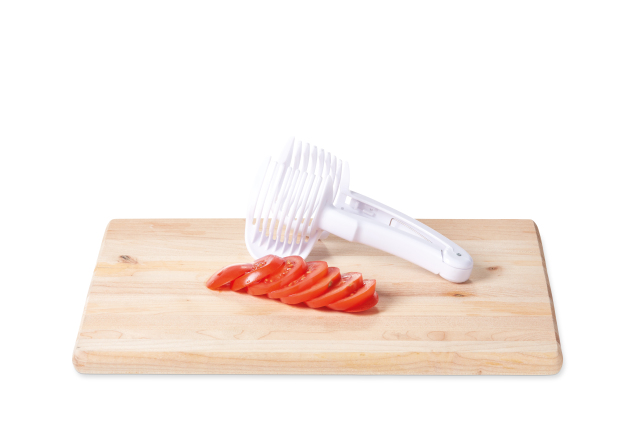 Cu acest dispozitiv puteti felia mancarea cu forma ovala sau rotunda ca de exemplu, oua, tomate, kiwi, etc., fara riscul de a va taia. Prindeti intre paletele dispozitivului, hrana pe care doriti sa o feliati si taiati printre fantele dispozitivului, astfel ve-ti obtine felii egale fara nici un risc sa va taiati.