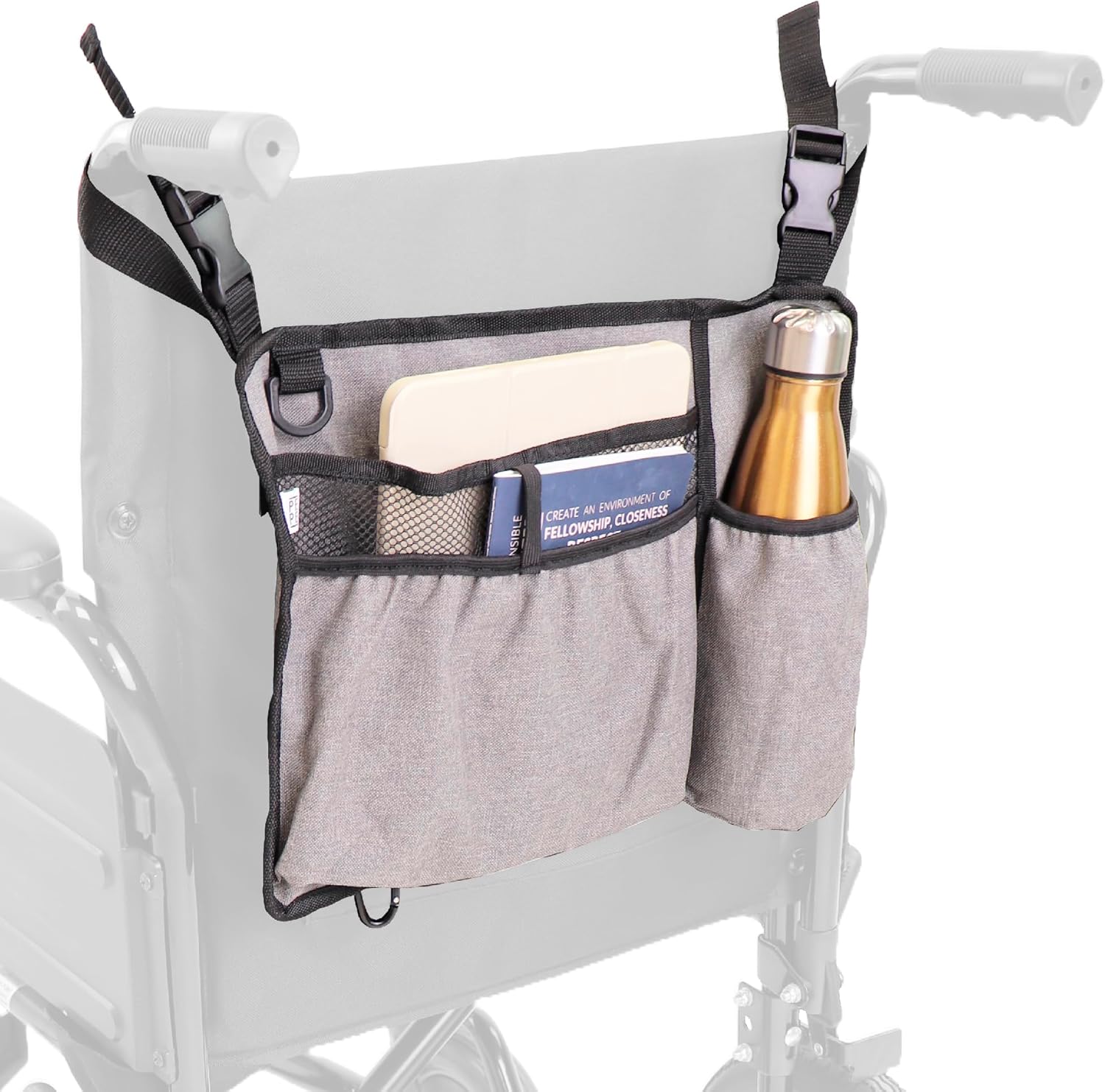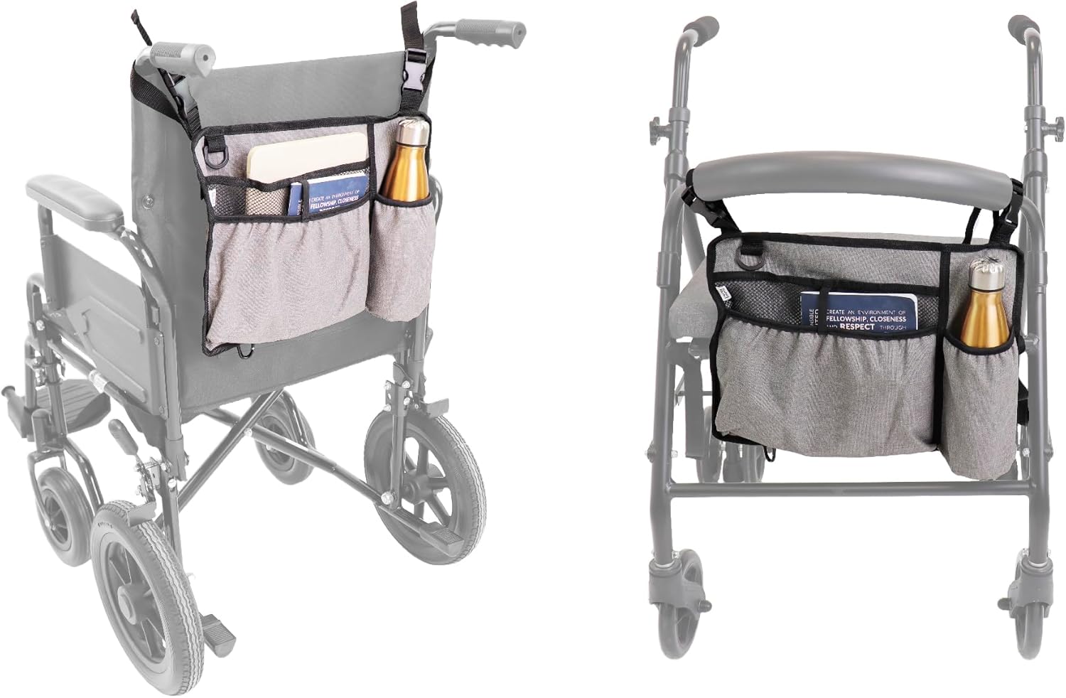 Datorita dimensiunilor universale, geanta poate fi folosita nu doar pe scaune rulante, ci si pe majoritatea cadrelor de mers. Este extrem de utila pentru ingrijitori, permitand acces rapid la obiectele necesare fara a opri deplasarea pacientului.