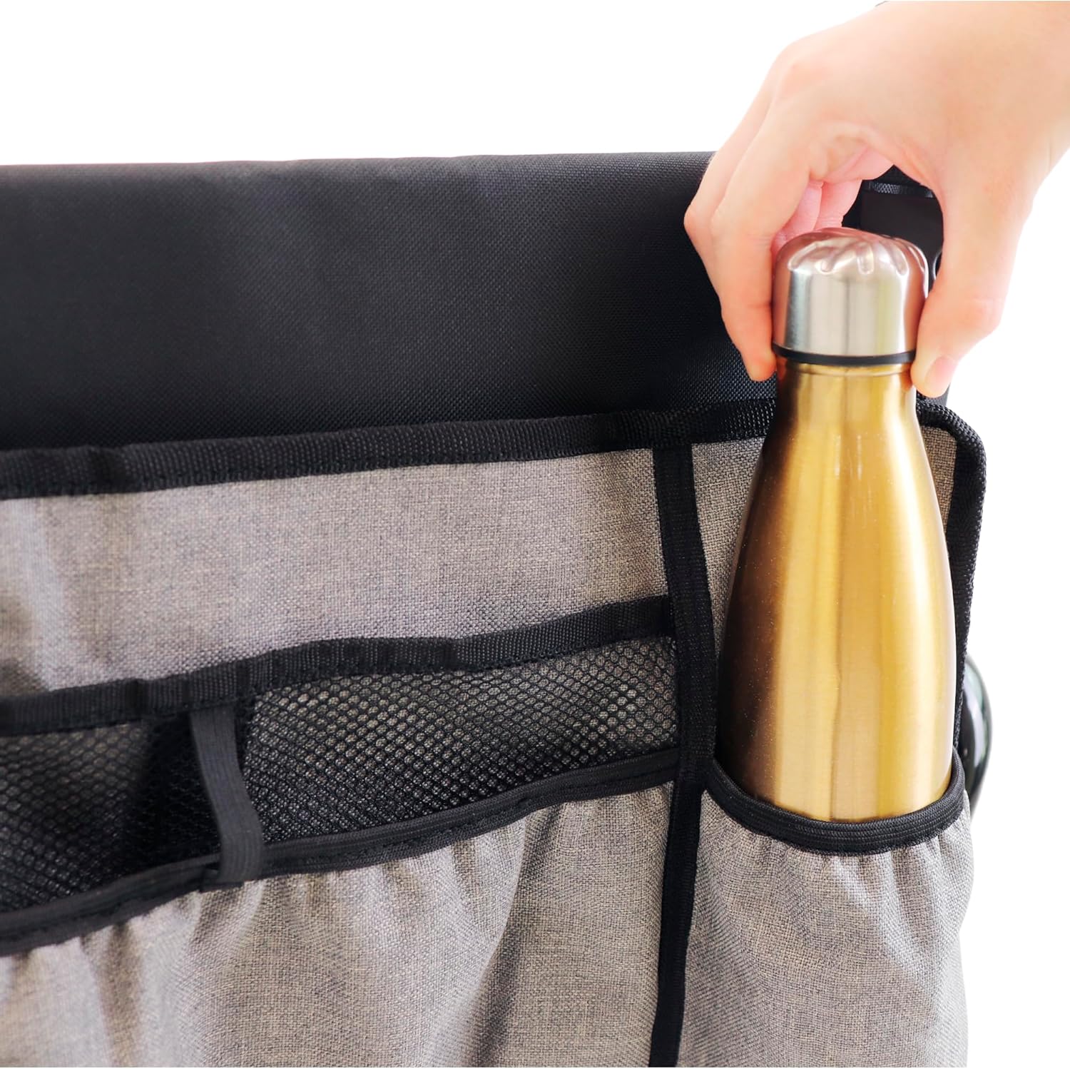 Geanta dispune de 5 compartimente practice: un buzunar principal incapator pentru haine, paturi sau accesorii medicale, doua buzunare laterale din plasa pentru obiecte mici, un suport dedicat pentru sticla sau pahar si un buzunar posterior cu fermoar pentru portofel, telefon sau documente.