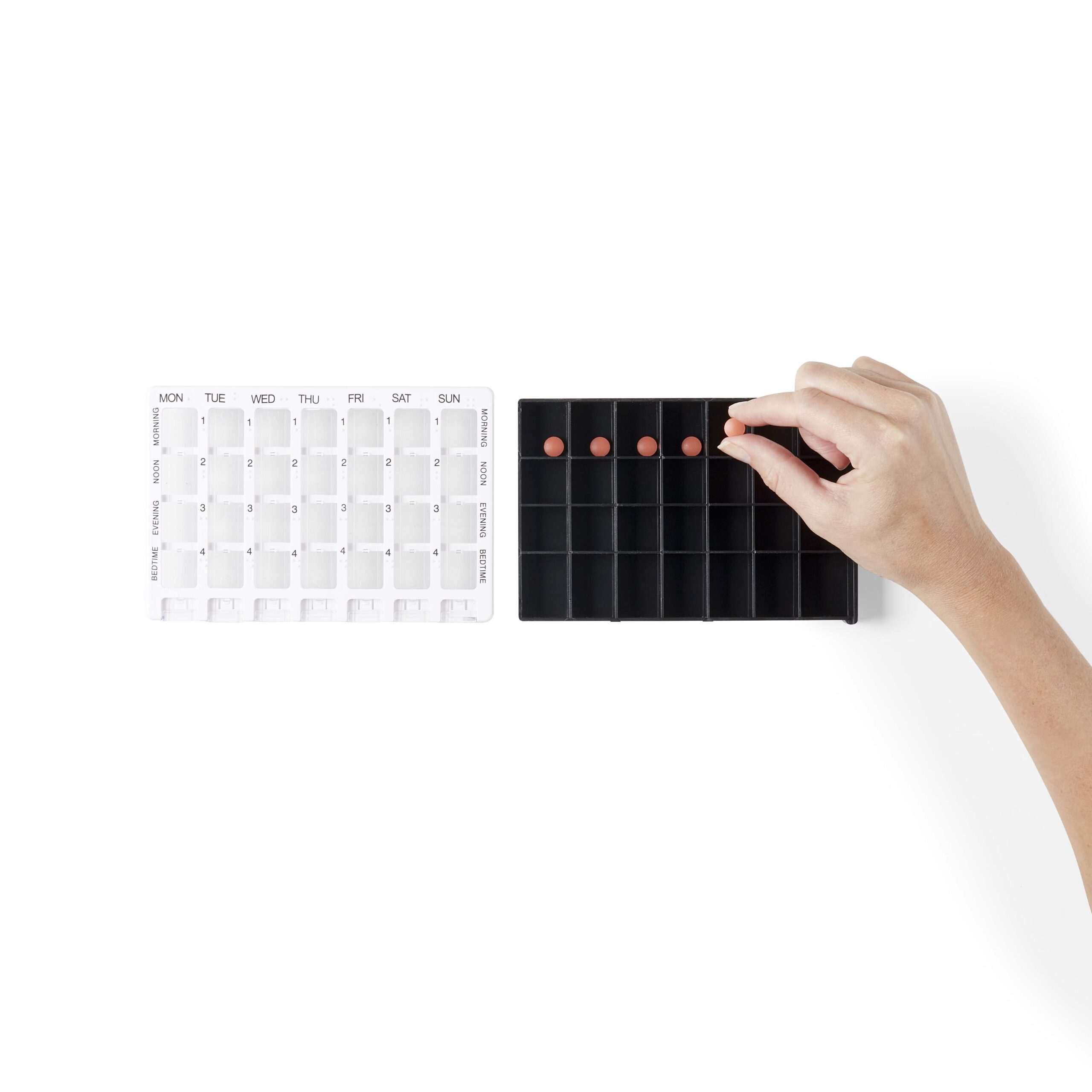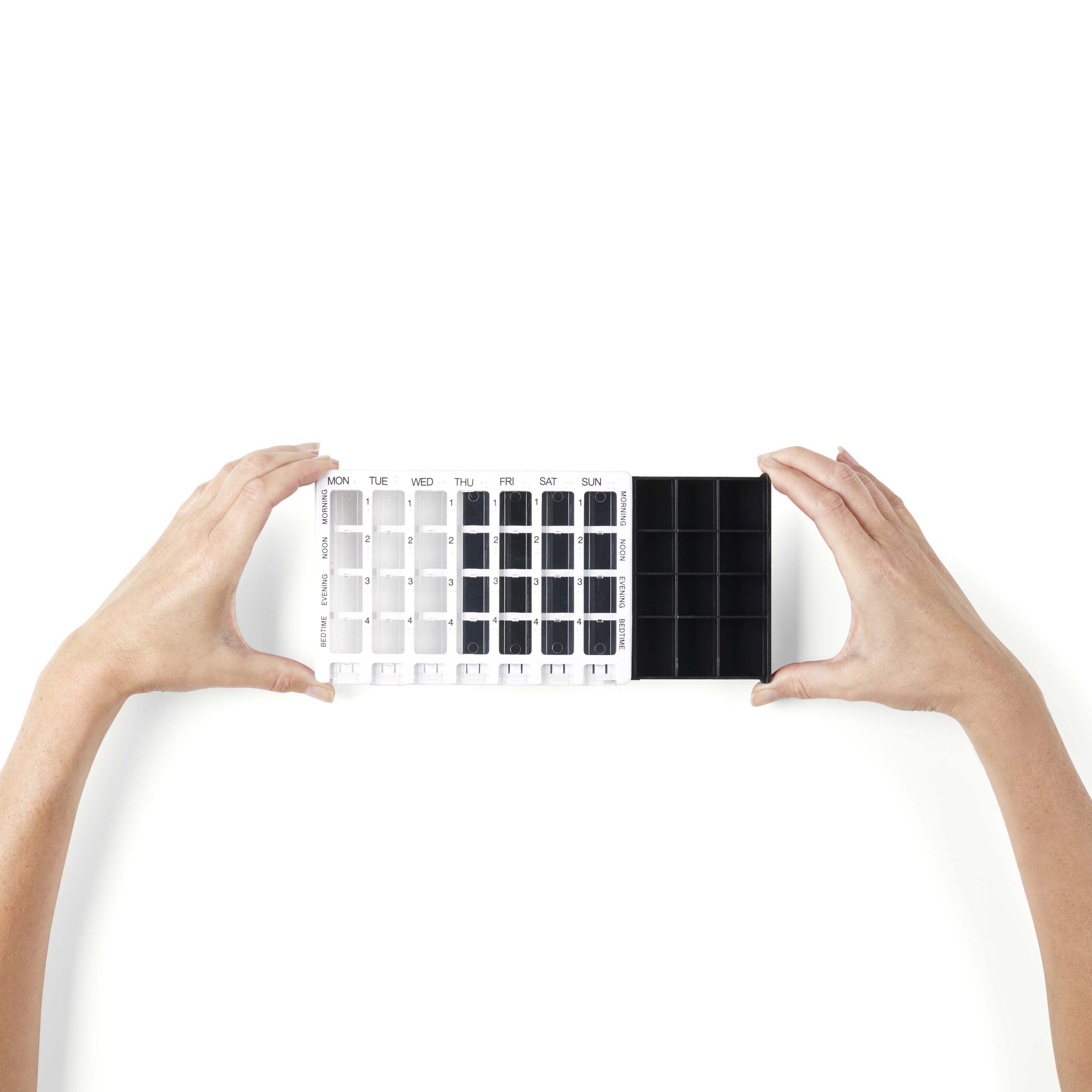 Organizator medicamente saptamanal, din plastic are 28 de compartimente dispuse pe 4 randuri in asa fel incat sa va puteti organiza medicamentele dupa bunul plac sau conform prescriptiei medicale.
