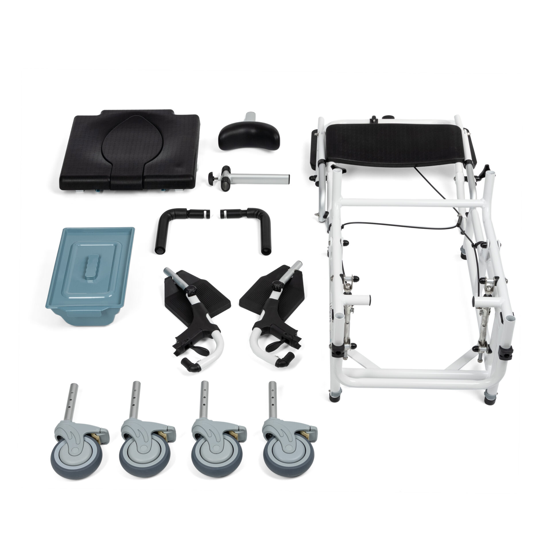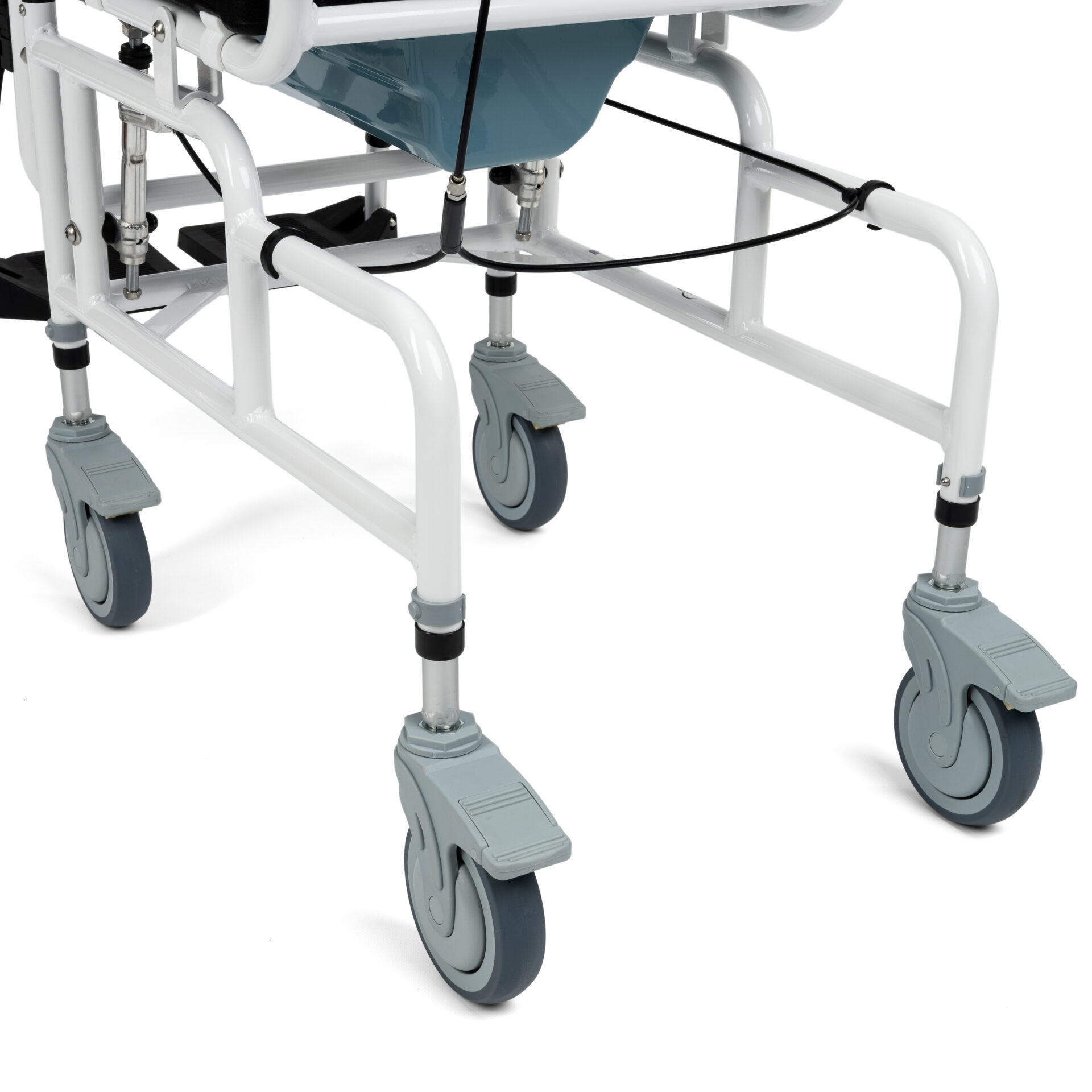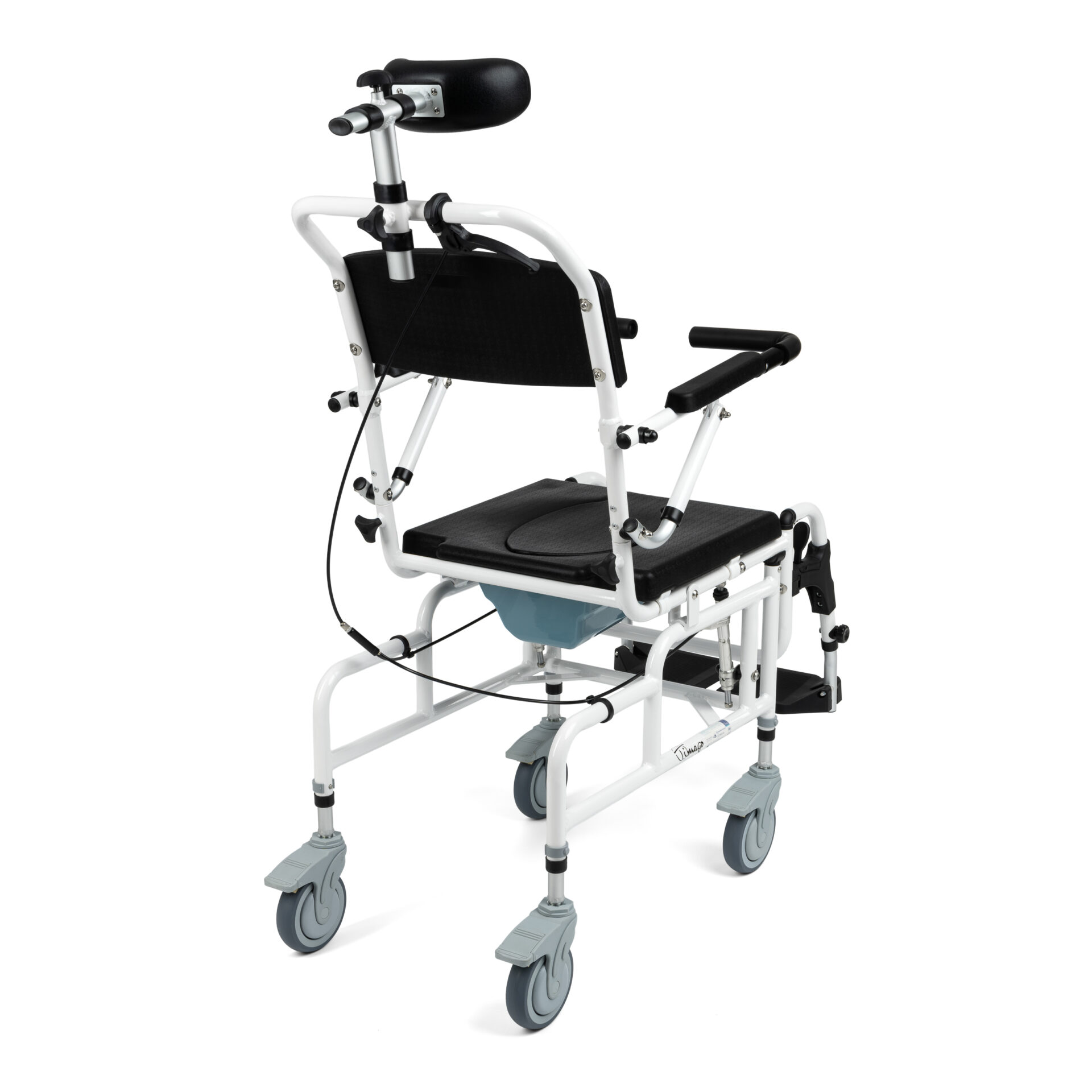 Scaun de transport pentru dus si toaleta cu inclinare MASTER-TIM PLUS – Scaunele de transport pentru dus si toaleta sunt concepute pentru persoanele care au probleme cu miscarea neasistata si pentru pacientii cu disfunctii si mobilitate redusa. Scaunul este potrivit numai pentru utilizare in interior. Scaunul poate fi utilizat numai cu asistenta unei persoane insotitoare. Scaunul functioneaza ca un scaun de transport pentru dus si toaleta datorita recipientului sanitar situat sub scaun si a celor patru roti pivotante. Acesta faciliteaza activitatile de igiena zilnica. Scaunul este recomandat in special persoanelor care au probleme de mobilitate cauzate de: paralizie, obezitate sau subponderalitate anormala, degenerari sau deformari ale membrelor, degenerari sau leziuni articulare, leziuni sau amputari ale membrelor, afectiuni cardiace si ale vaselor de sange si tulburari circulatorii.