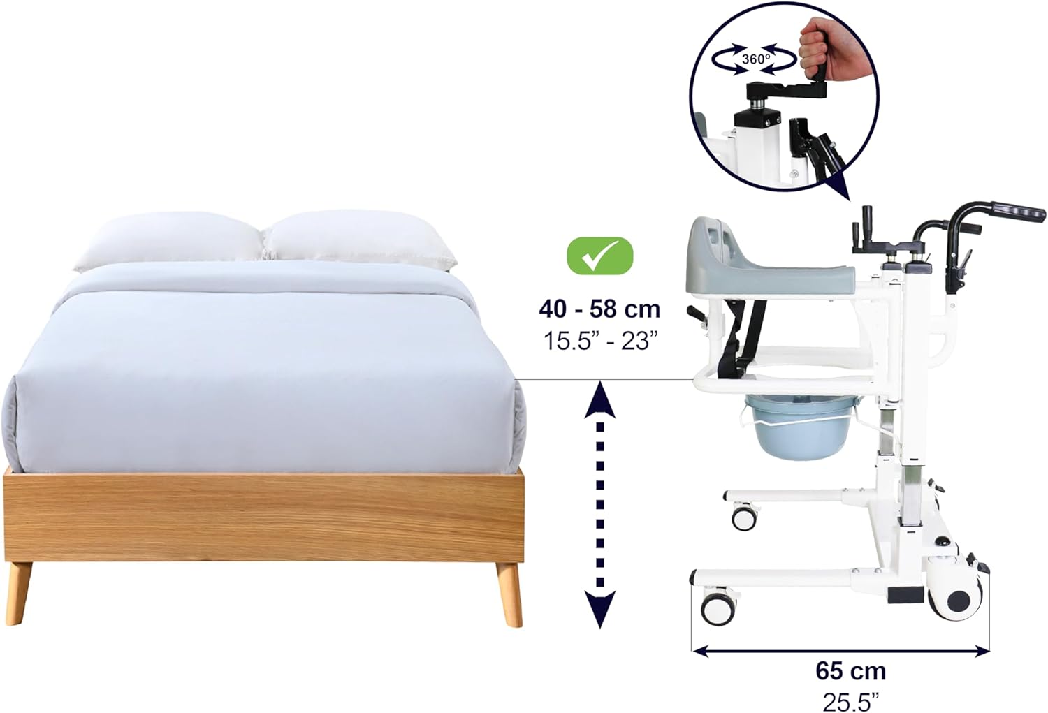 Scaun hidraulic pentru transfer pacienti 3 in 1 (scaun toaleta, scaun pentru dus si scaun pentru transfer) – sarcina maxima 100 kg, KMINA este solutia ideala pentru transferul persoanelor cu mobilitate redusa intre pat si toaleta, fara a fi necesara ridicarea completa in sezut. Designul rabatabil la 180° si reglajul pe inaltime il fac usor de utilizat atat de catre utilizator, cat si de catre ingrijitor. Produsul este prevazut cu galeta integrata, putand fi utilizat ca toaleta portabila.