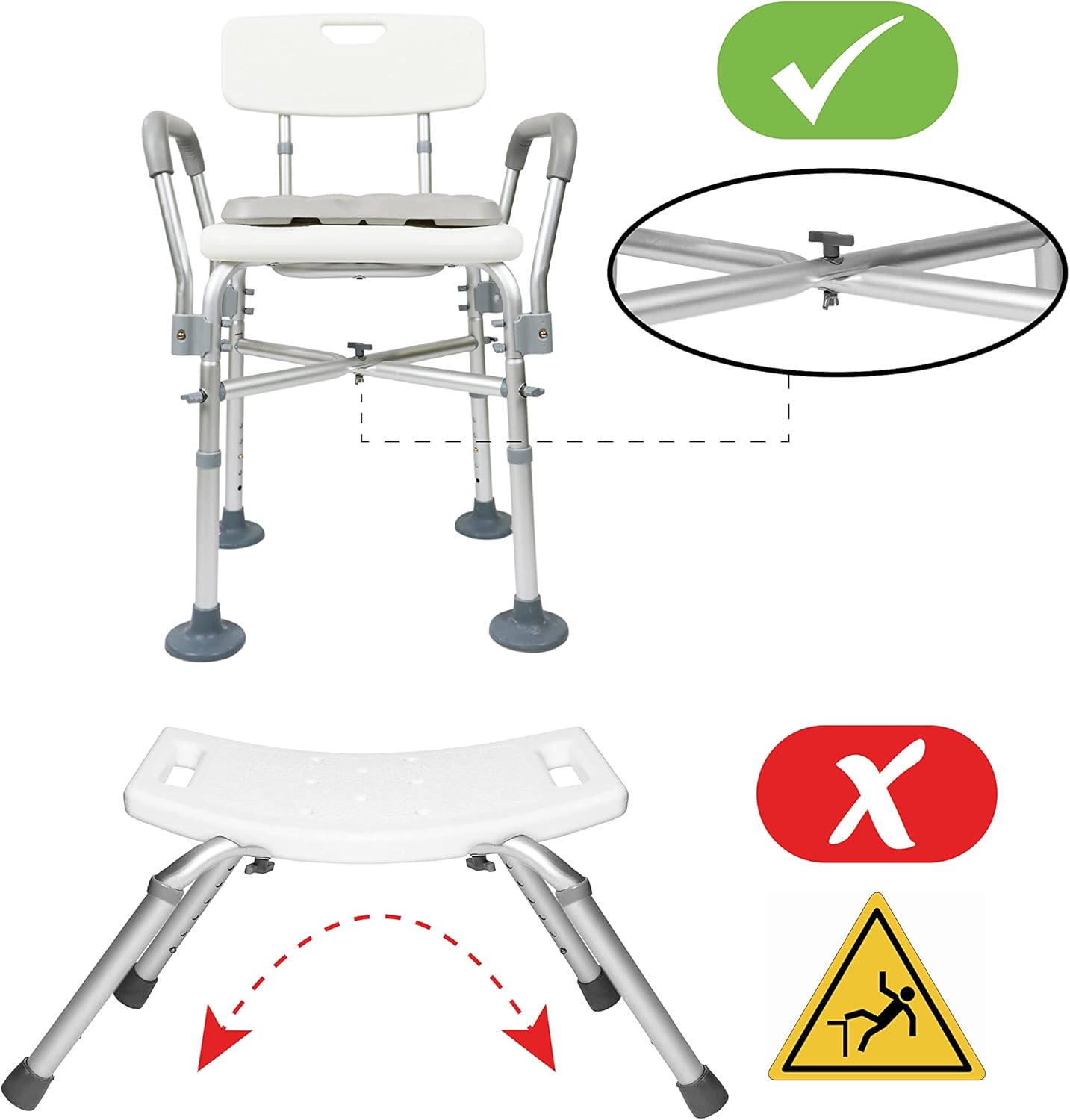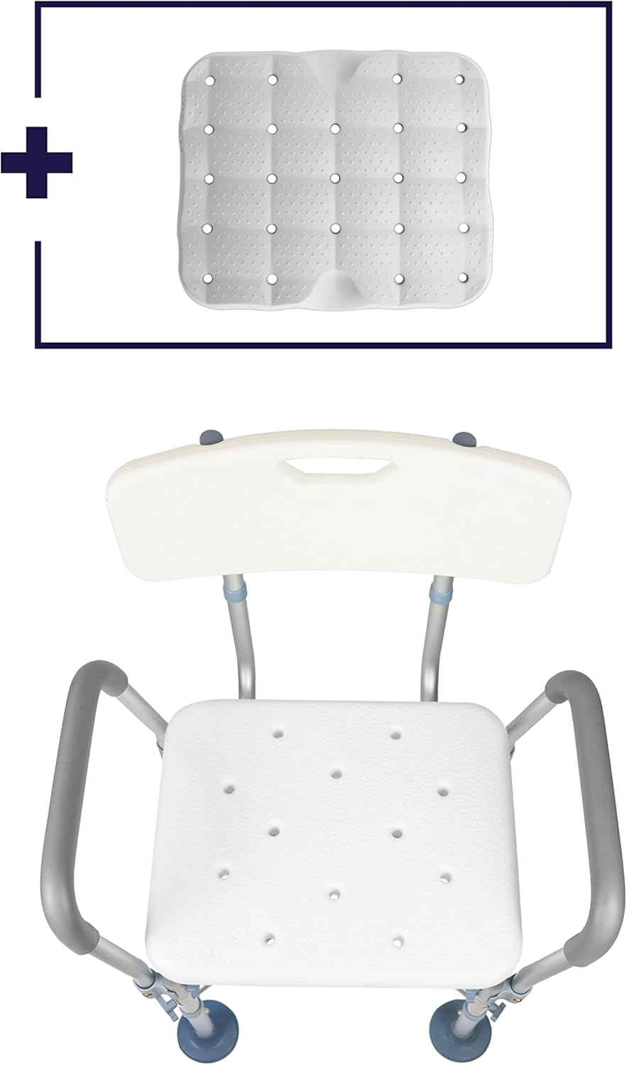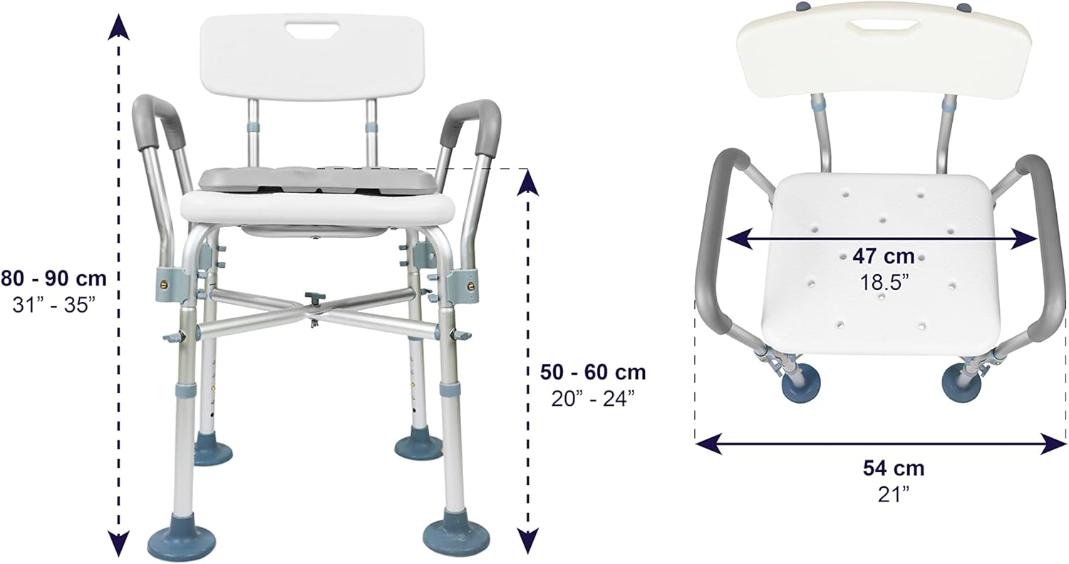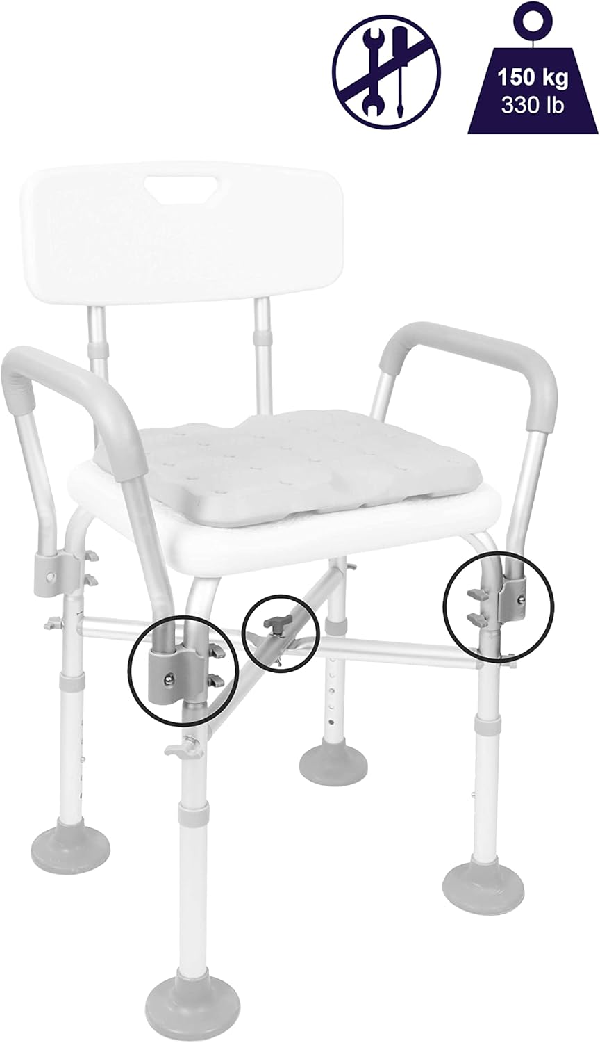 Scaunul de dus este ideal pentru persoanele in varsta, femei insarcinate sau persoane cu mobilitate redusa. Cotierele si spatarul capitonate, impreuna cu perna rezistenta la apa, ofera confort si sustinere optima.