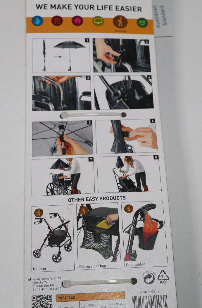 Umbrela/parasolar protejeaza utilizatorii de scaune cu rotile impotriva ploii și a soarelui. Umbrela/parasolar are un diametru de 72 cm, un cadru ranforsat care ii permite sa reziste mai bine rafalelor de vant si un strat UV la interior pentru a proteja pielea impotriva radiatiilor UV de la soare. Partea de mijloc este din metal, partea de jos și partea de sus sunt flexibile, astfel incat umbrela de soare sa poata fi indoita la unghiul dorit. Prin apasarea butonului de pe partea inferioara a arborelui, umbrela/parasolar poate fi, de asemenea, mutata de la dreapta la stanga, astfel incat utilizatorul de scaun rulant sa poata sta mereu la umbra.